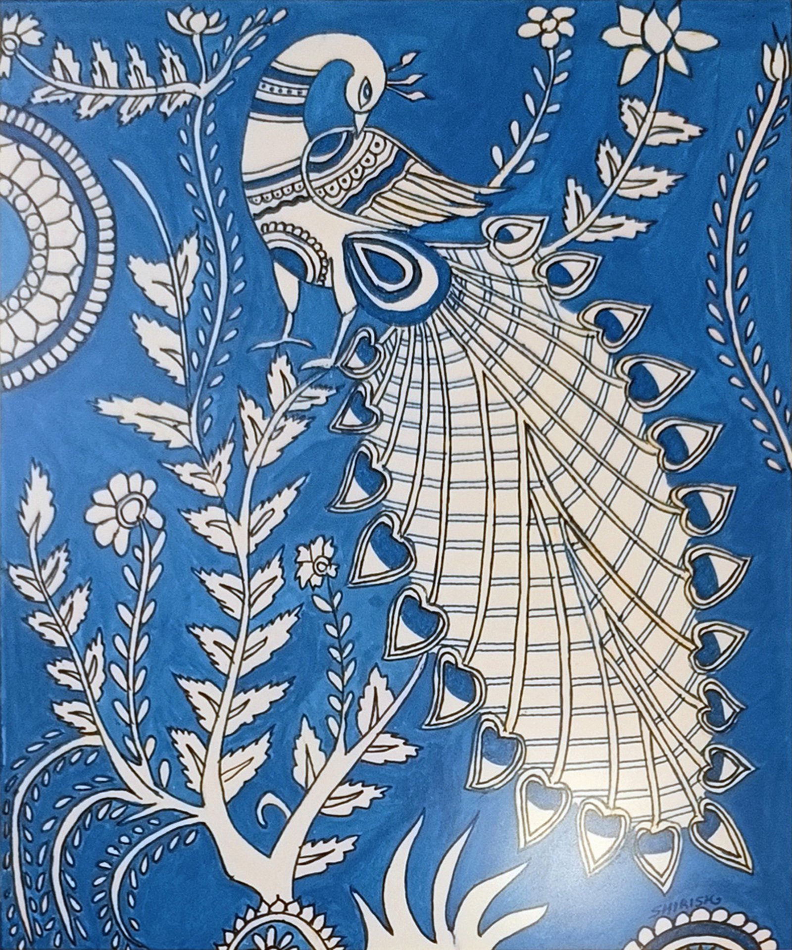 Lovingly crafted by hand on 10″ x 12″ paper, this framed work features delicate white paint on a tranquil blue background. The minimalist contrast highlights every intricate motif and brushstroke, turning simplicity into sophistication.
