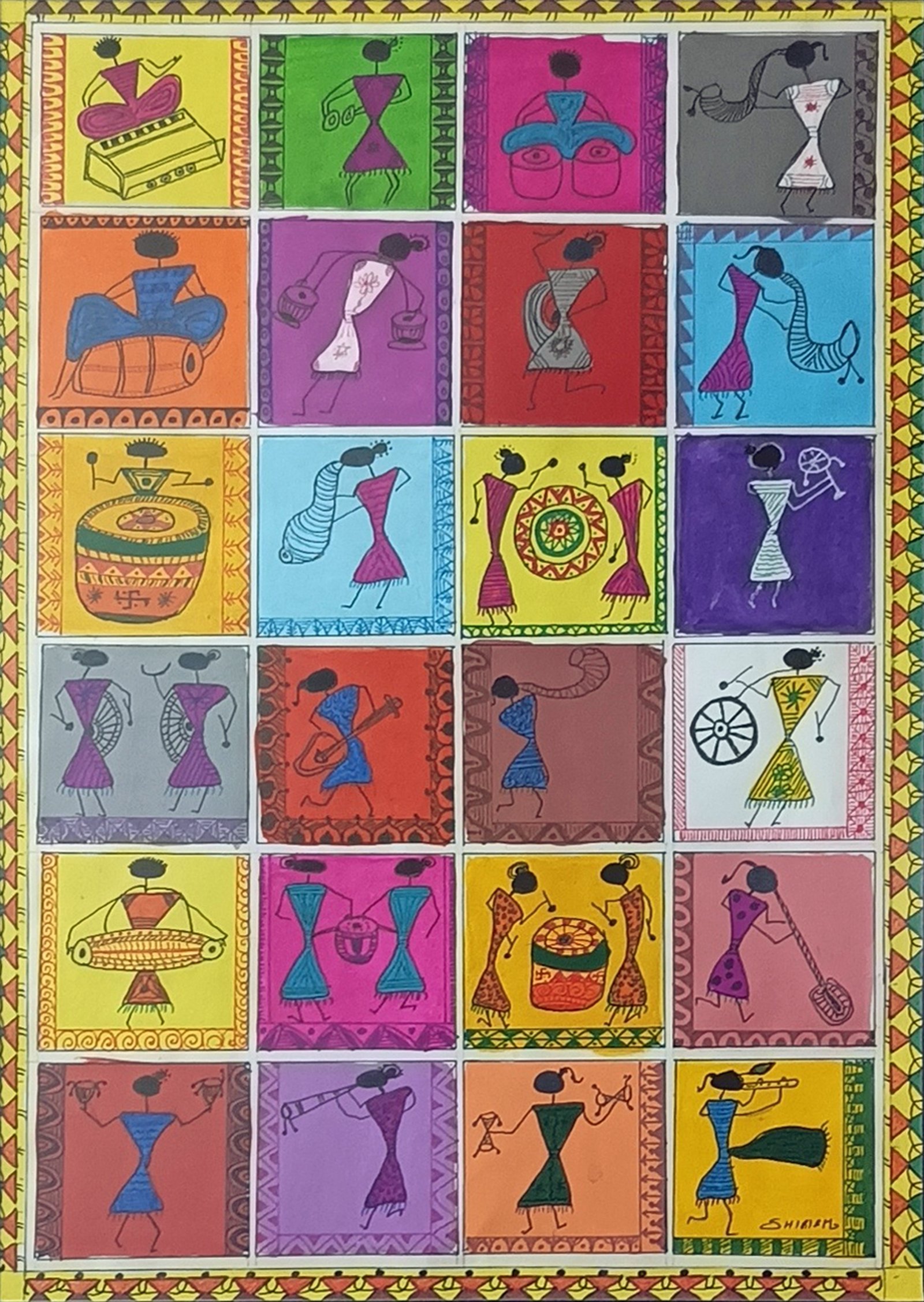 Experience the vibrant soul of tribal artistry with the Hand-Painted Framed Warli Multi-Colour Activity Grid Portrait — a symphony of colour, culture, and craftsmanship. Every section of this intricate grid tells a story of life, movement, and community through the ancient language of Warli art.
