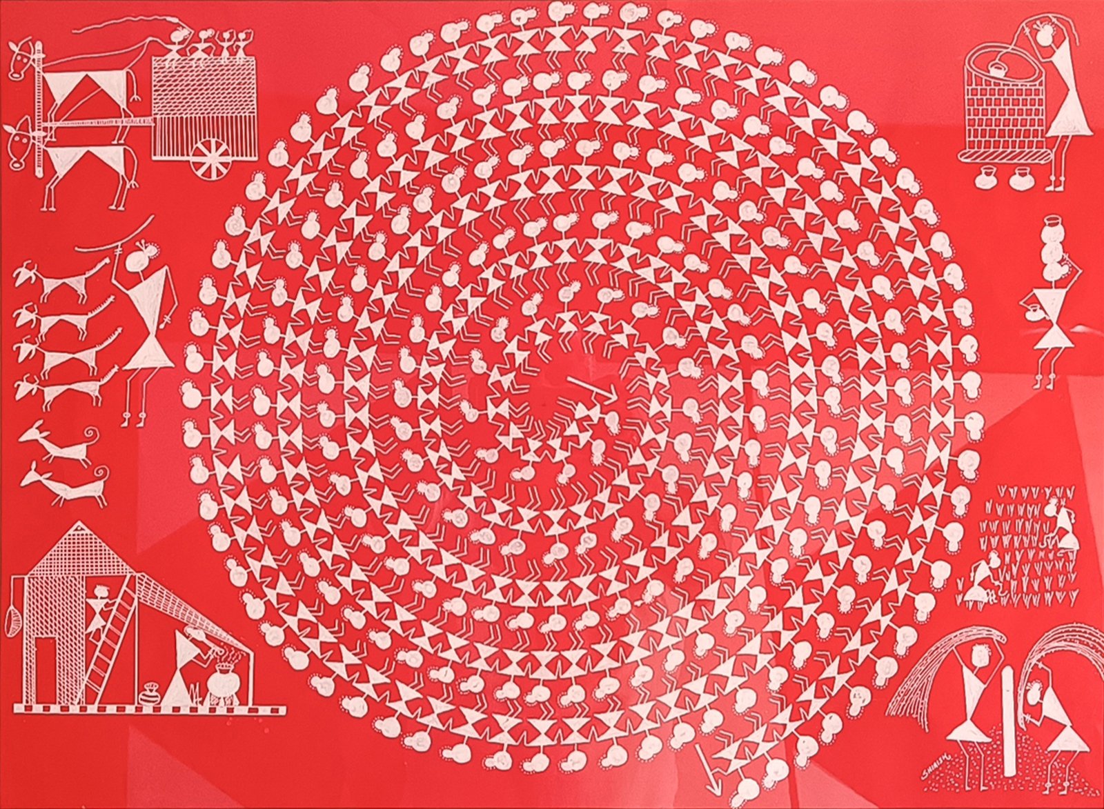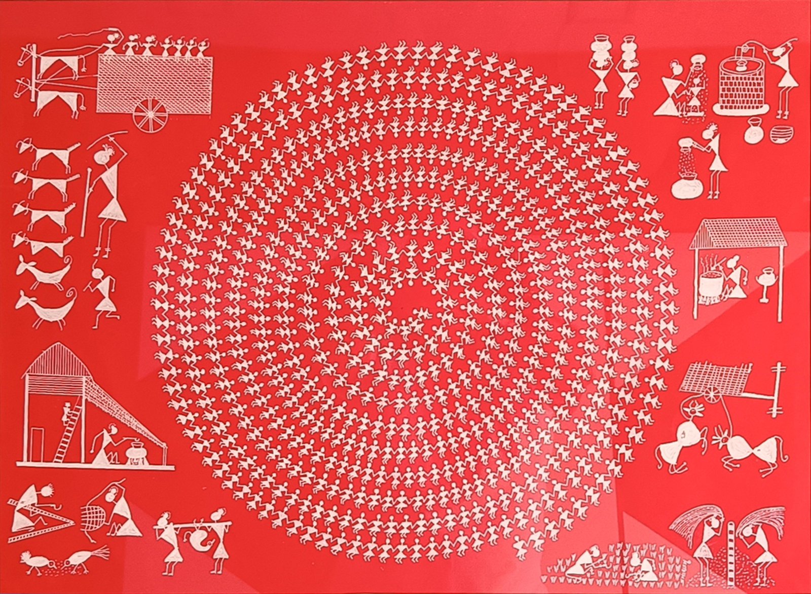 Meticulously painted by hand on 25″ x 18″ paper, this framed masterpiece features white pigment on a rich red background, creating a striking contrast that draws the eye and warms any space. Every brushstroke speaks of tradition, patience, and timeless rhythm — an ode to cultural unity expressed through simplicity and grace.